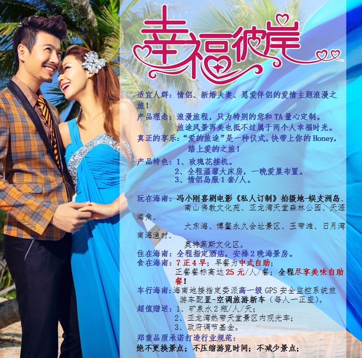 住宿标准: 全程入住指定酒店,特别安排2晚海景房,全程温馨大床房;一晚爱巢布置(兴隆酒店安排)。